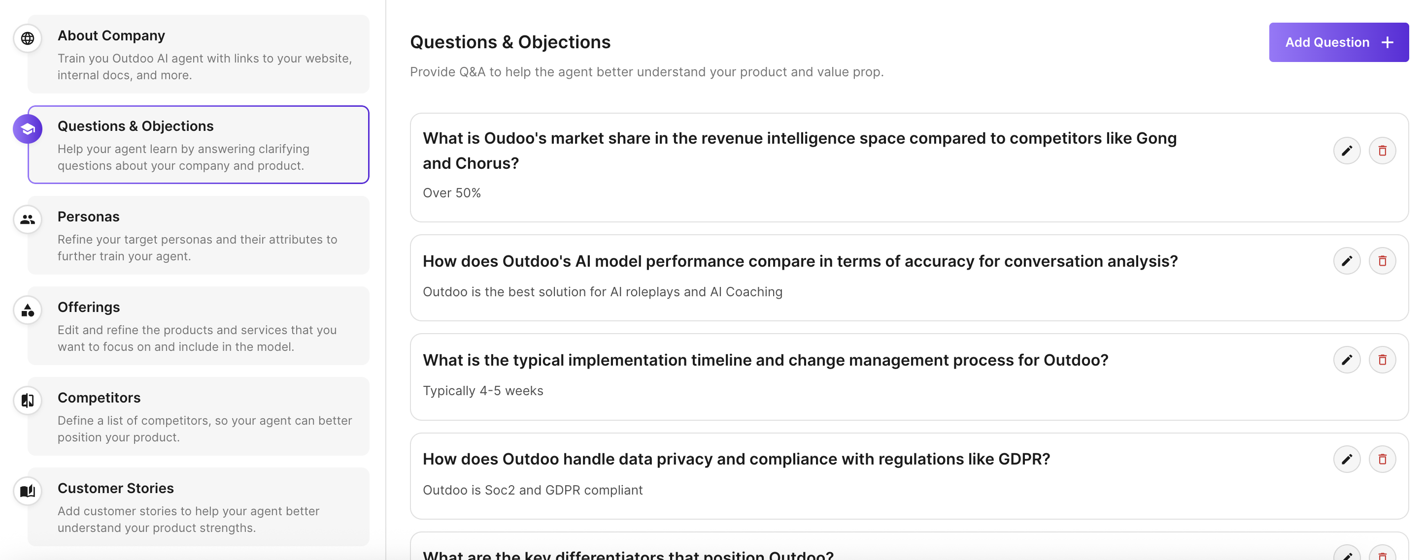 This helps the model understand the most common questions, concerns, and objections your customers raise, along with the ideal responses. By configuring Q&A pairs, you’re effectively training the AI to mirror how your team handles tough conversations—whether it’s clarifying product features, addressing pricing concerns, or overcoming hesitation. Capturing these scenarios not only sharpens the model’s ability to respond with accuracy and confidence but also ensures consistency in messaging across coaching simulations, roleplays, and customer-facing interactions. Over time, this builds a stronger knowledge base that reflects your team’s best practices and reinforces your positioning in the market.