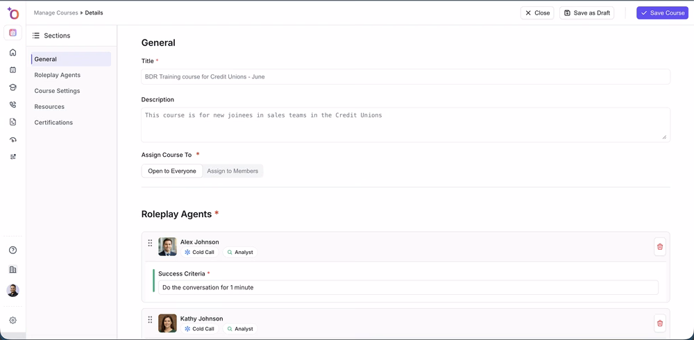 An SDR and an enterprise AE need completely different practice scenarios. A new hire needs a different track than an experienced rep going through a messaging refresh. Build separate courses for each role and situation. The marginal effort of building two courses instead of one is much lower than the cost of training people on scenarios that do not match their job.