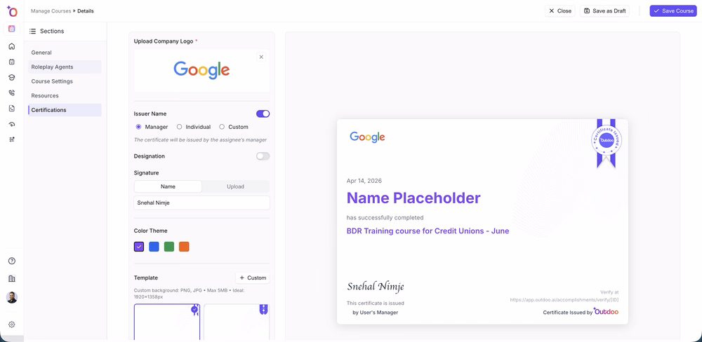 A rep who passed a certification eight months ago may not reflect current messaging. L&D teams at fast-moving companies set expiry dates on certifications and require recertification annually or when messaging significantly changes. Outdoo certifications are dated — you can build recertification cadences around them.