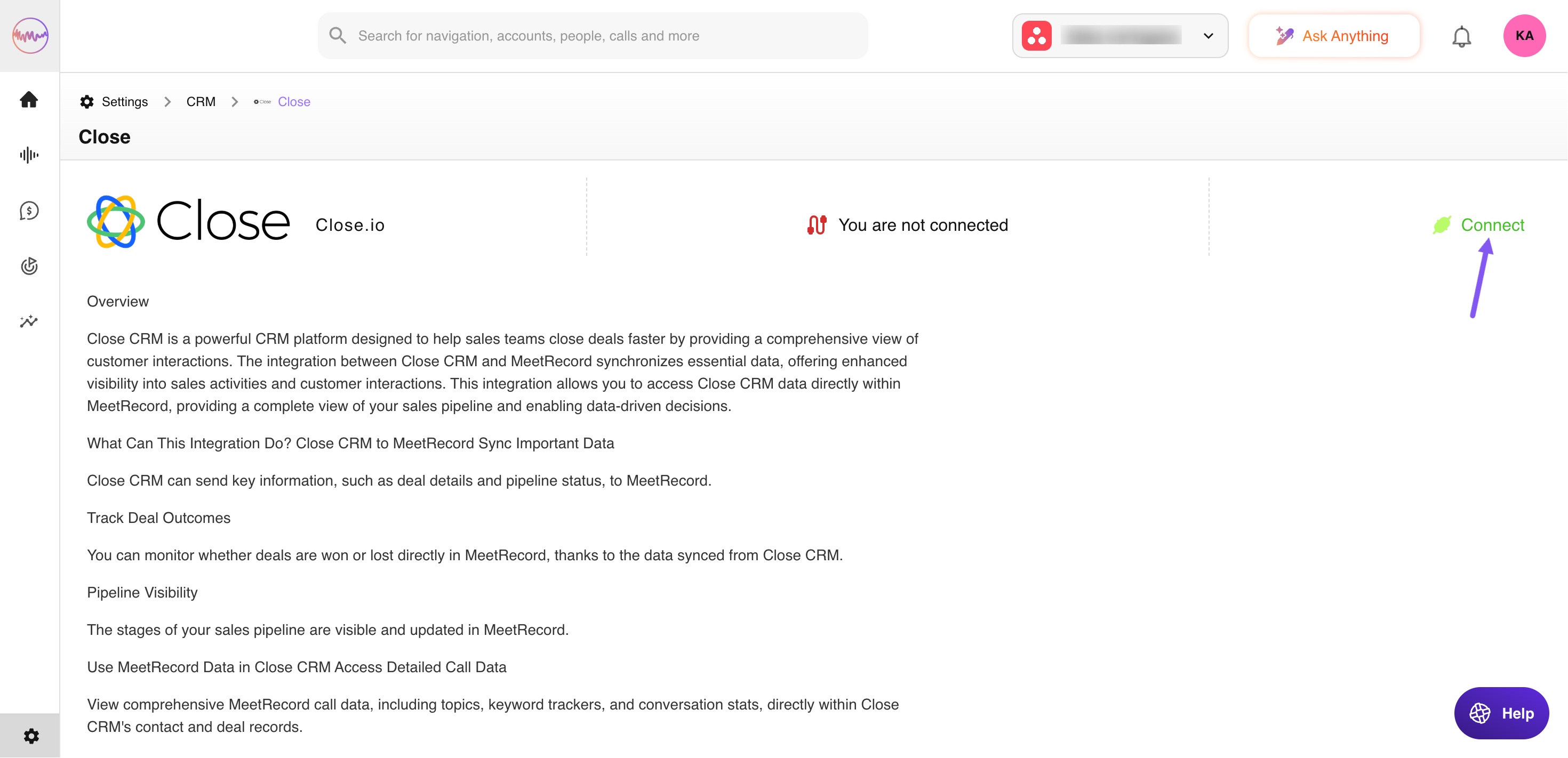 - The icon should change from "Connect" to "Connected". That’s it! Your Close CRM and Outdoo AI integration is complete.