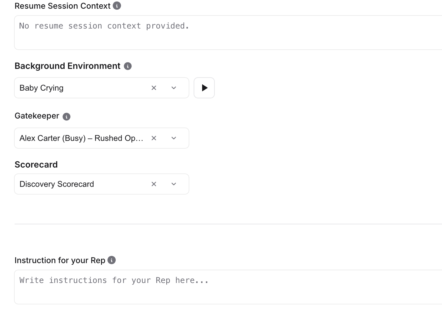 - Agent — evaluates the main conversation (usually enabled only if the rep passed the gatekeeper).