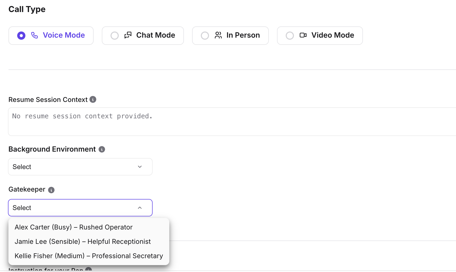 - In the agent’s Roleplay Format (or equivalent) settings, ensure Call Type is Call only (or In person where applicable).