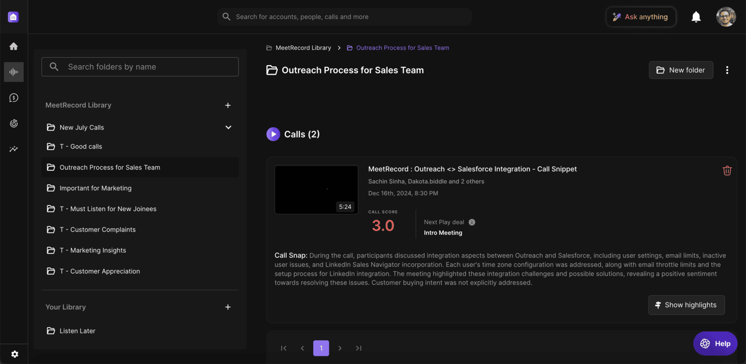 Folders in Outdoo AI help you organize calls and call snippets, making it easier to find, review, and collaborate. Use folders to keep your calls accessible, share insights with your team, and streamline workflows.