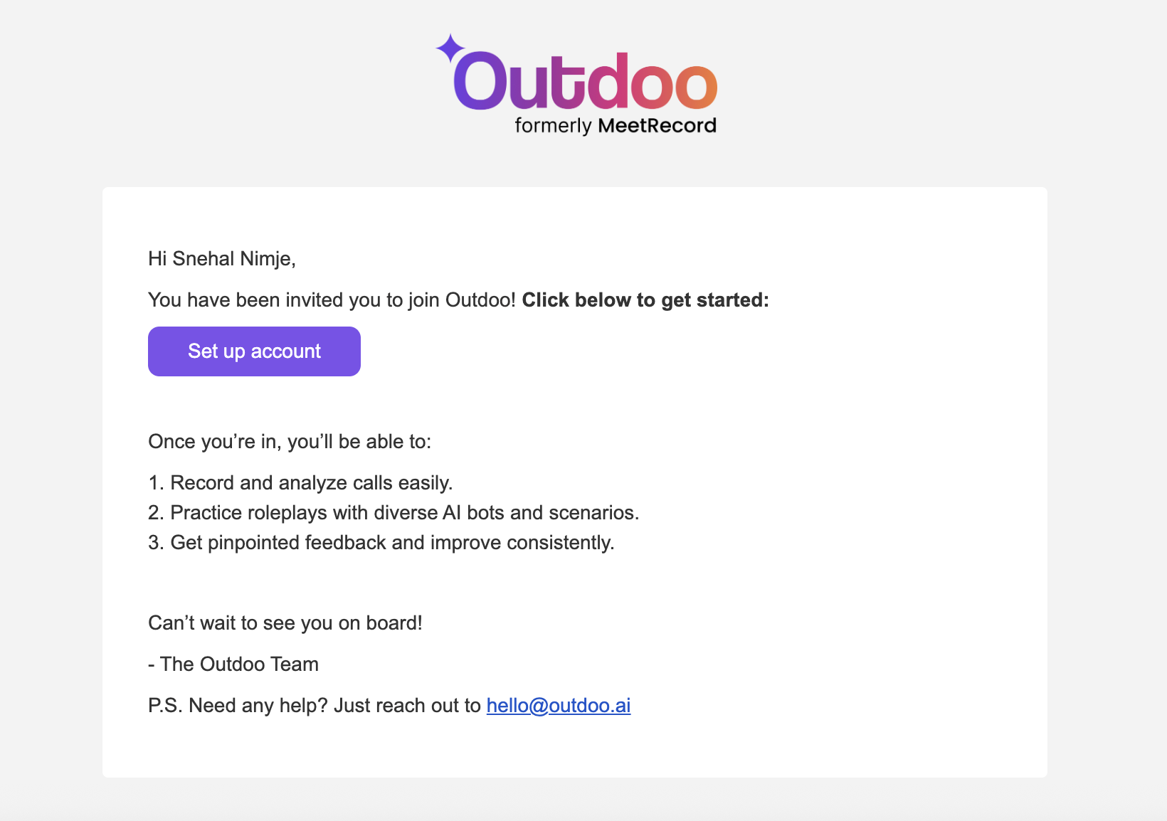 Your journey with Outdoo AI begins with an invitation from your organization's admin. Keep an eye on your email inbox for a notification that includes a unique link to create your account.