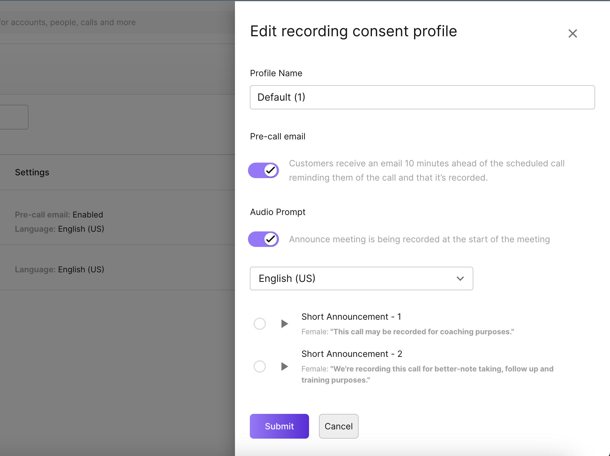 - Go to Company Settings > Conversation Capture > Recording Consent Profile.
