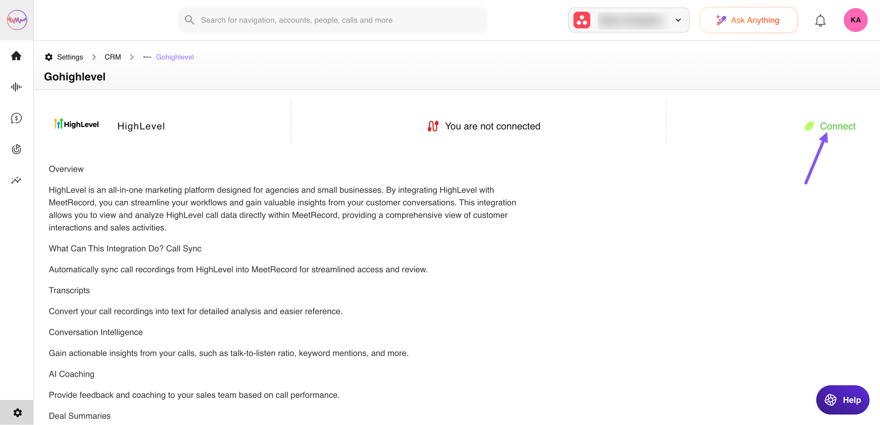 - Go to Company Settings > CRM > All CRMs and click on HighLevel