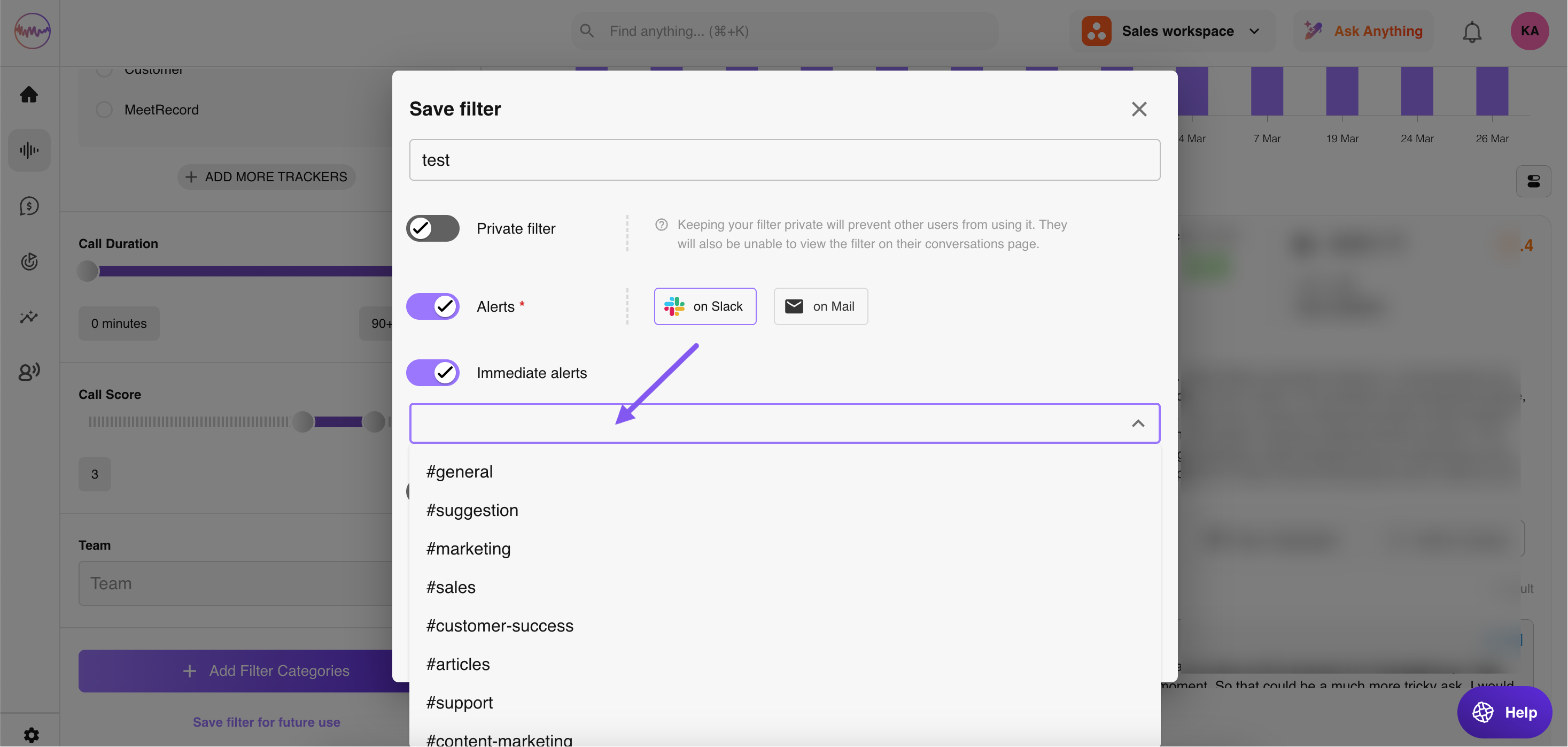 Choose slack and select alert frequency. For example, in image below Slack alert will go to #recordings channel immediately and weekly in #sales channel as a collection of these meetings.