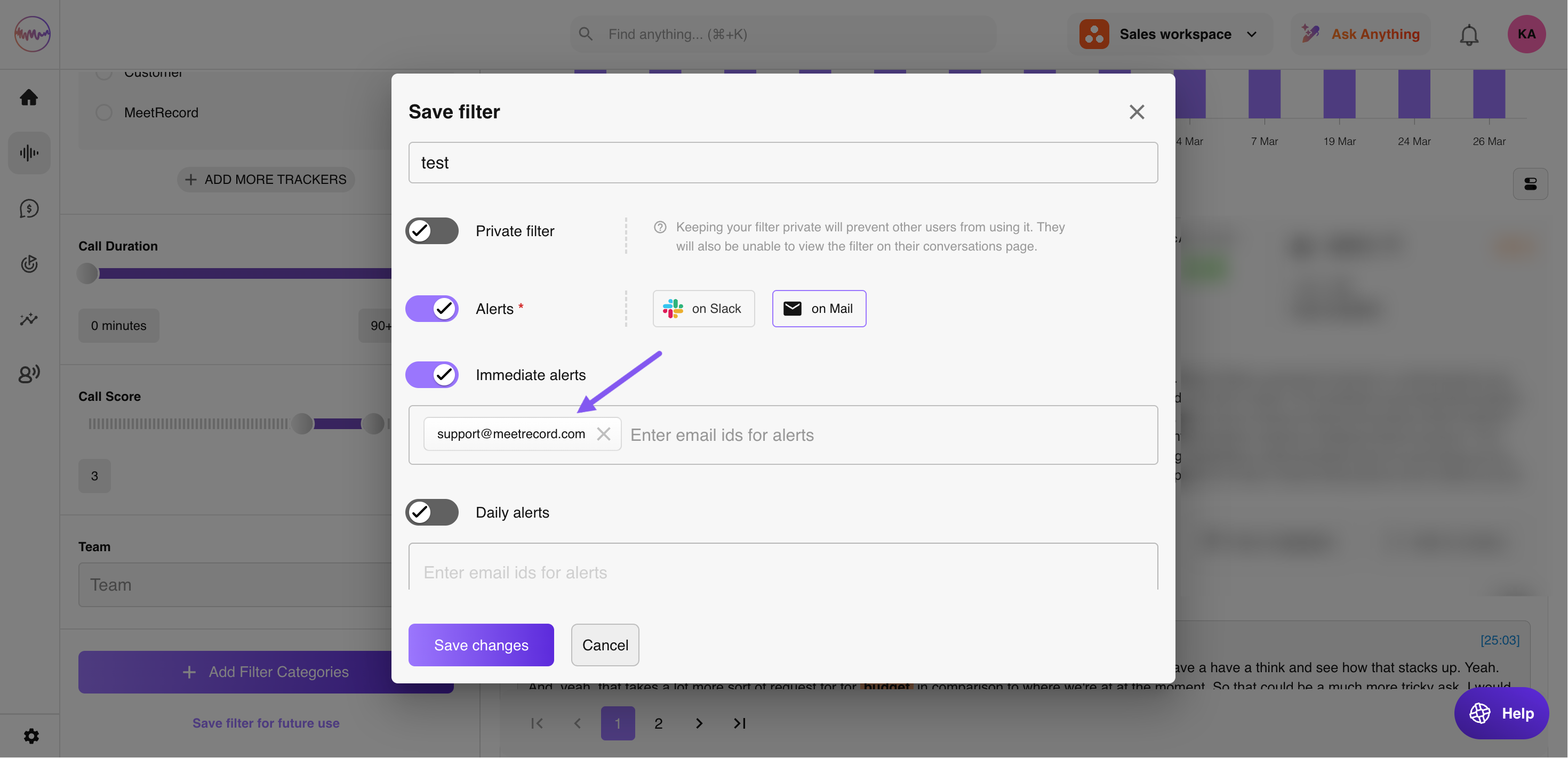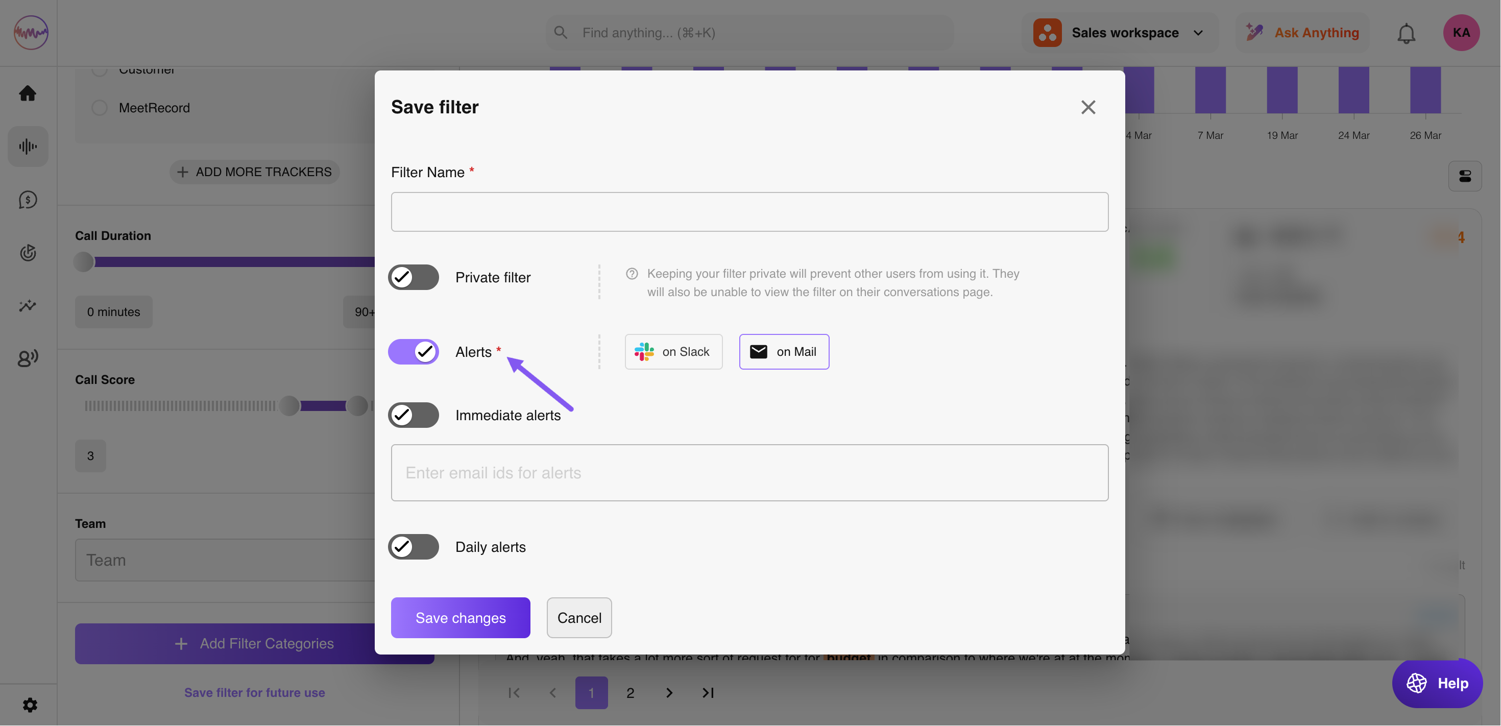 2. In the pop up, name this filter and click on Enable alert. You can choose alert medium to be email or Slack.