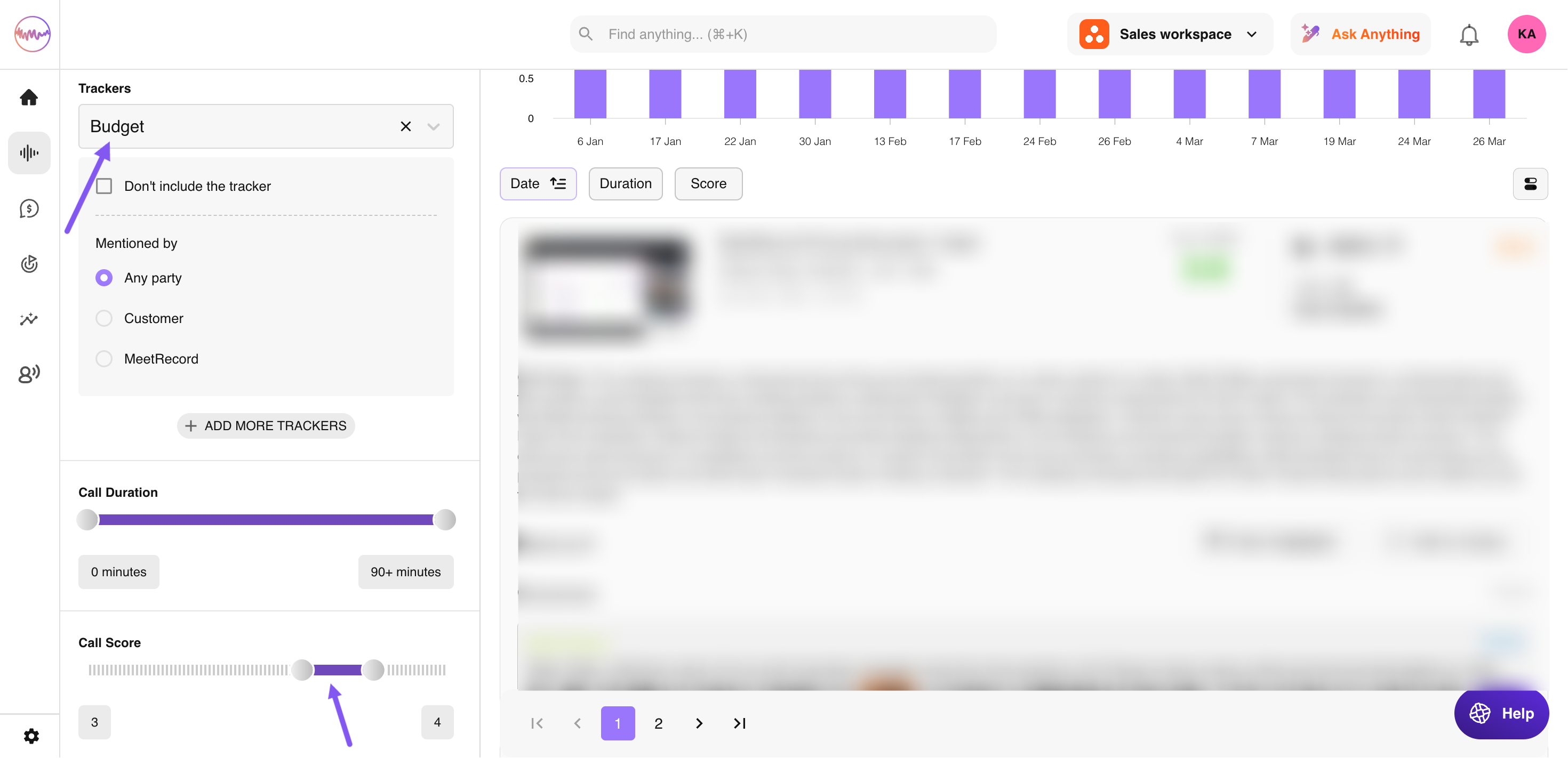 1. Go to Conversations > Calls and choose filter for your alert. You can choose multiple criteria. For example, in image below we are creating alert for meetings scored between 3-4 and have Budget tracker. Click Save, to save as filter.