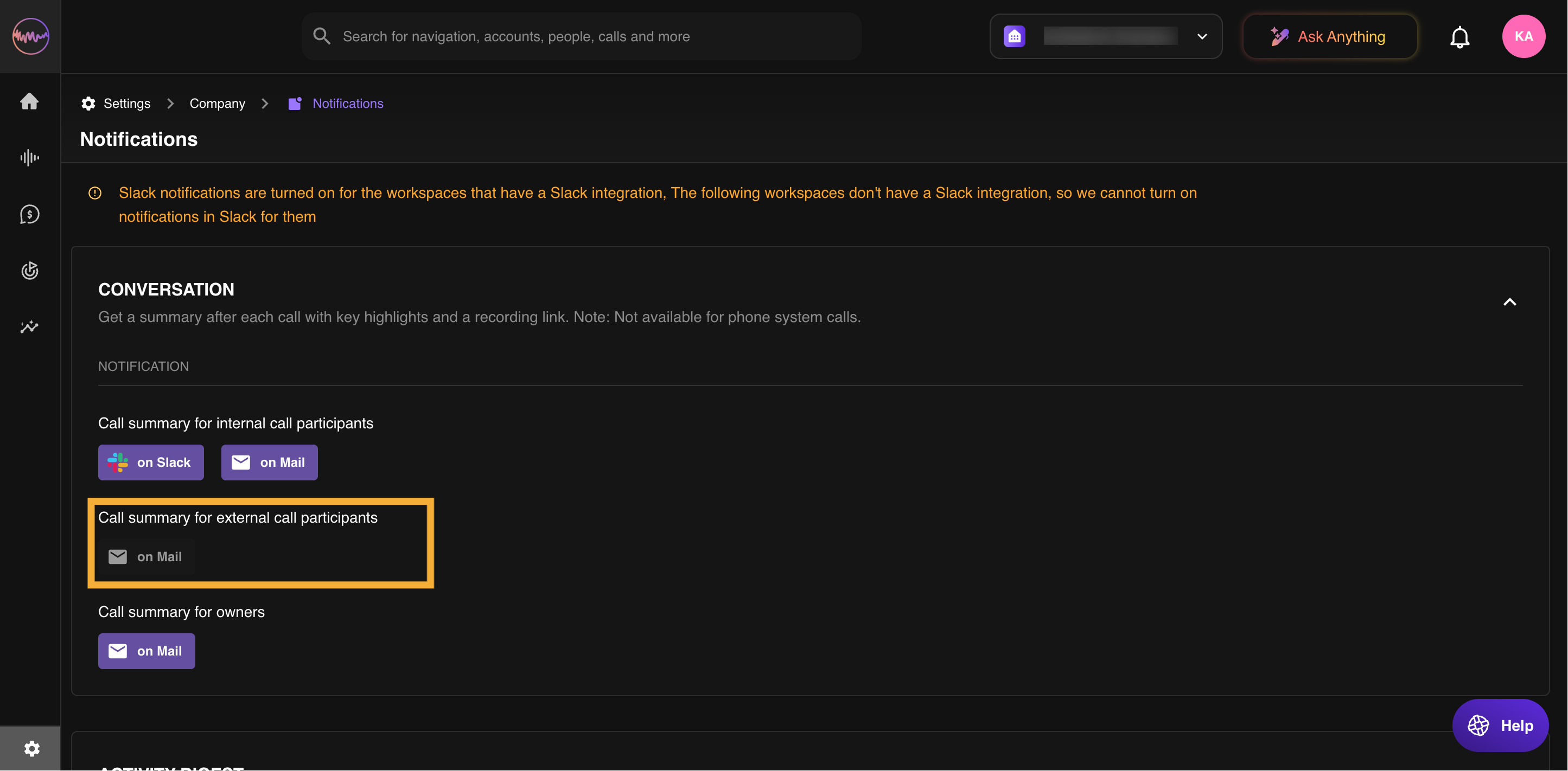 If you want to prevent call summary emails from being sent to external participants (customers), you can disable this setting at the company level.