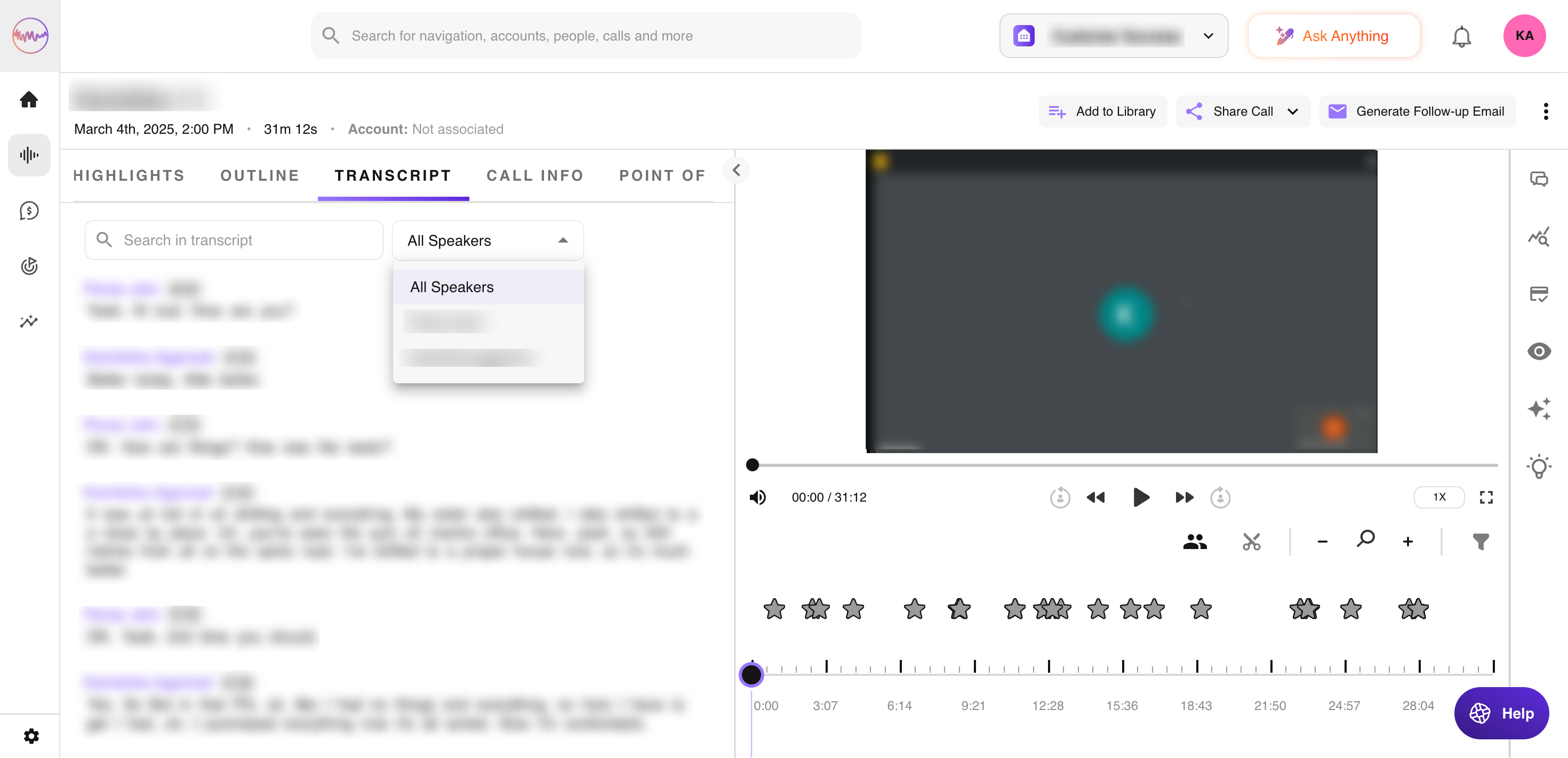 On a specific call page, you can use the search bar in the Transcript tab on the top left panel to search for words or phrases spoken during the call. This feature lets you quickly access the information you need from any call.