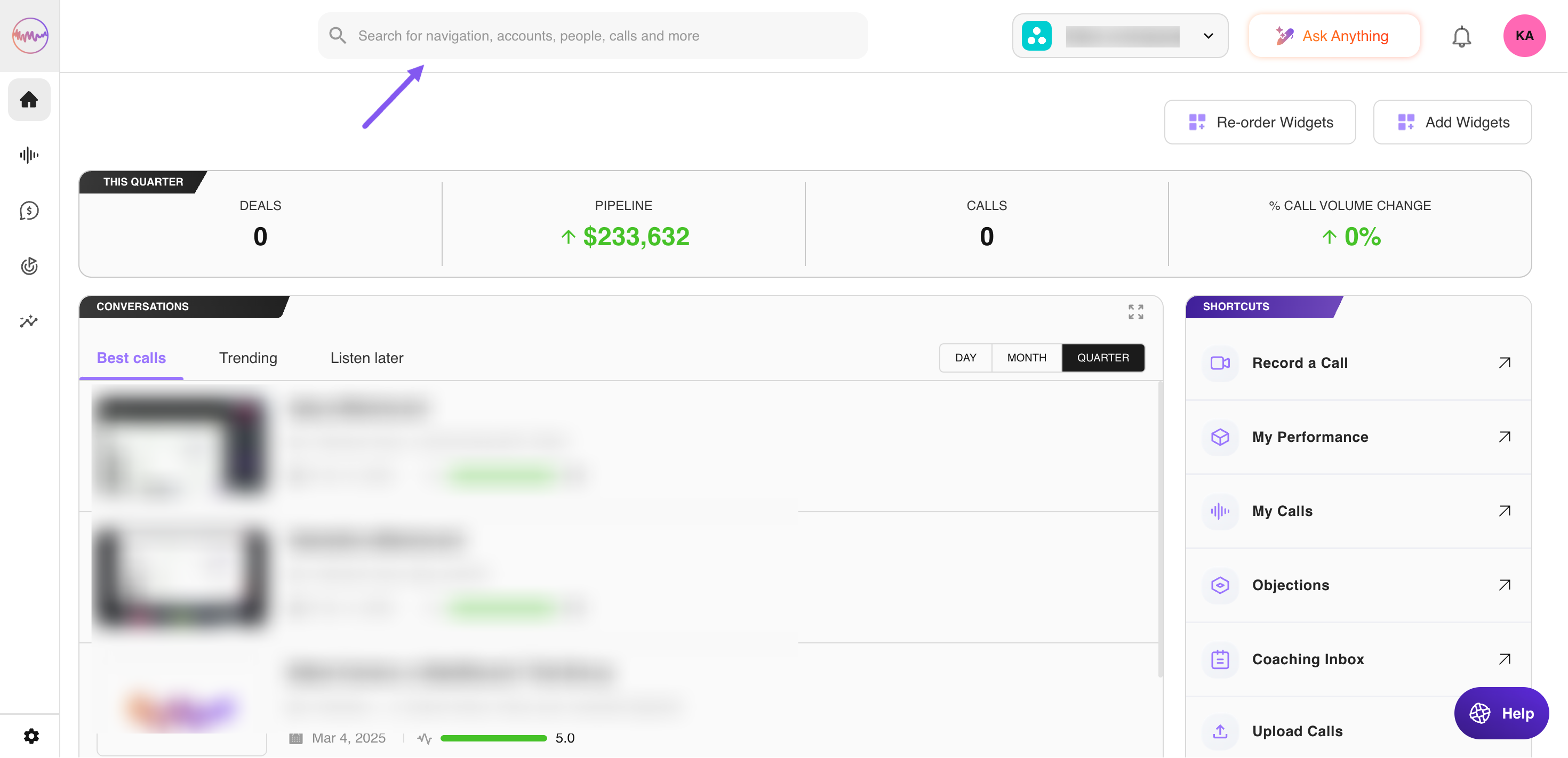 The general search option is conveniently located in the top navigation bar. Use this feature to find customer accounts, calls with particular team members or customers, and calls with specific phrases.