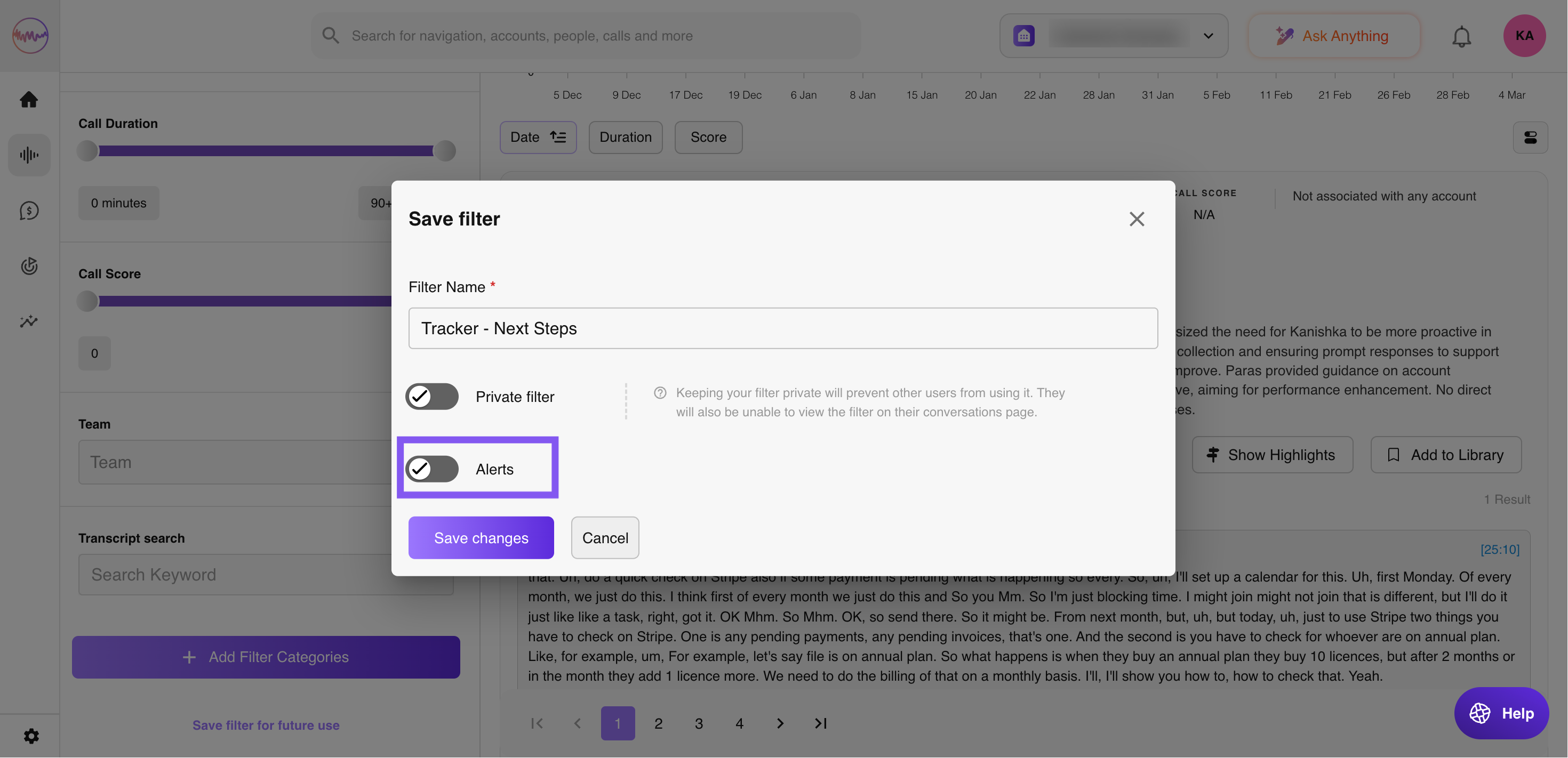 Set up alerts to be quickly notified if/when something important happens with your team. One of our personal favorites is if "Next Steps" aren't discussed in a call during the Negotiation stage.