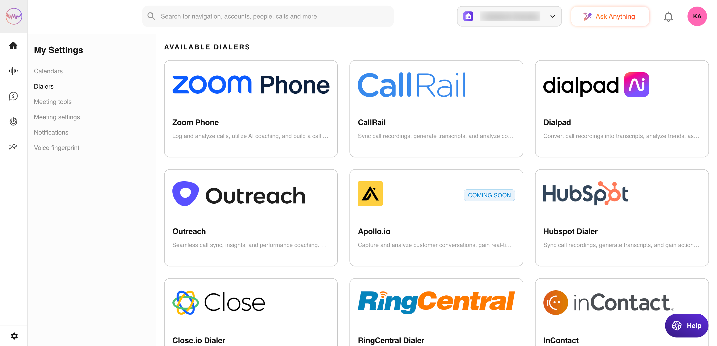 Dialers: Shows whether your dialer is integrated and the calls are being imported into Outdoo AI.