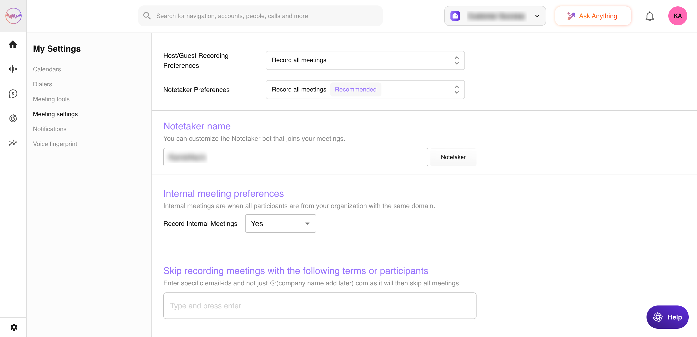 This section indicates if you are set up for meeting recording and highlights any issues. Customize your Notetaker bot's name to personalize how it appears in your meetings. Choose whether to record internal meetings where all participants share your organization's domain. To skip recording specific meetings, enter individual email addresses or keywords—avoid using general domains like "@company.com" to prevent skipping all meetings.