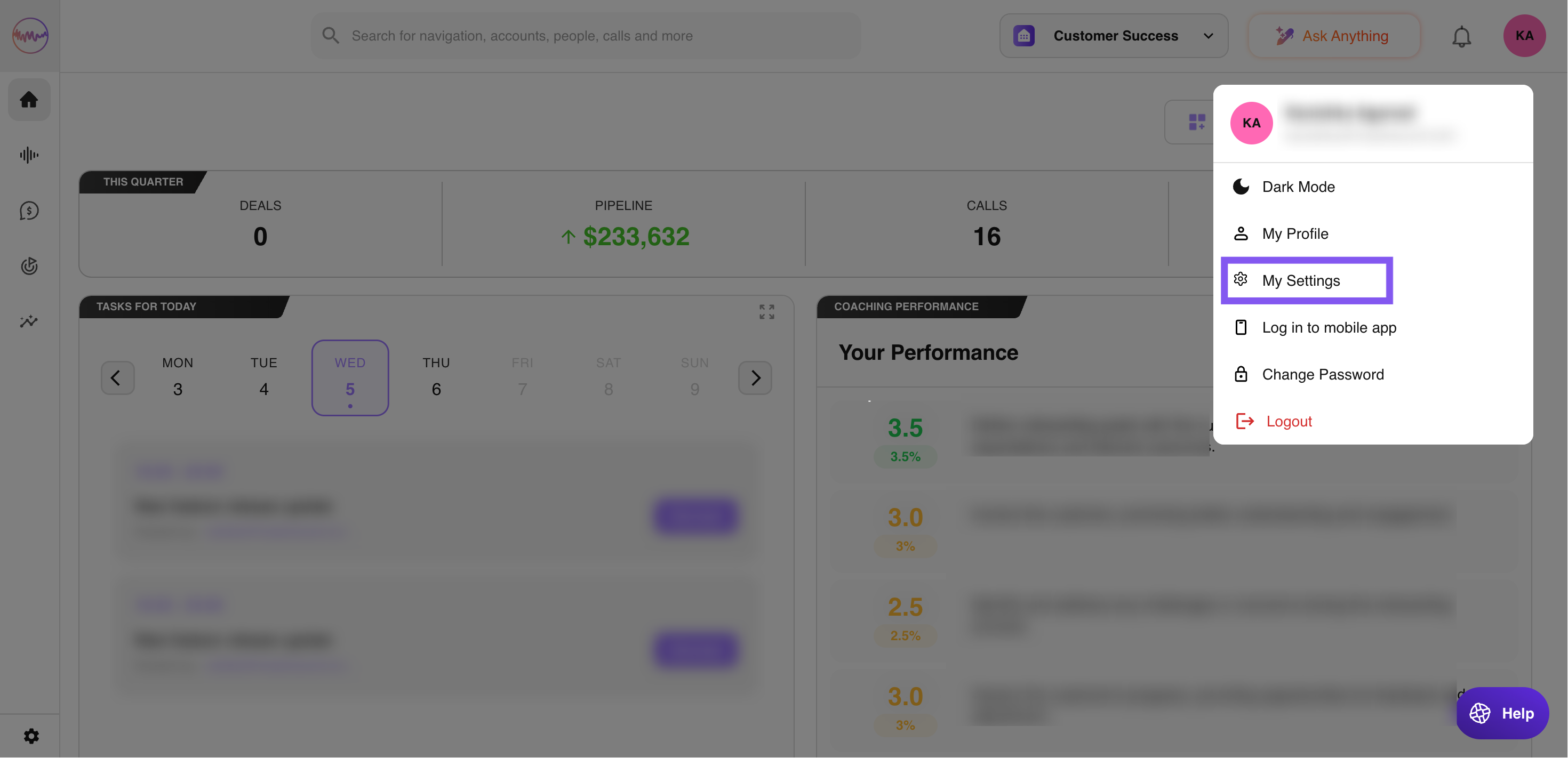 To access your settings in Outdoo AI, navigate to the top navigation bar, click on your name, and then select "My Settings." Here, you can view the configurations set up for you in Outdoo AI. While most of the information is read-only, you may need to visit this section to complete your setup, opt into voice identification, or identify your business or tech admin.