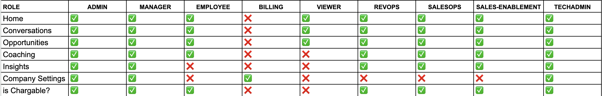 - Billing: Limited to account and billing-related functions. No access to conversation or opportunity features.