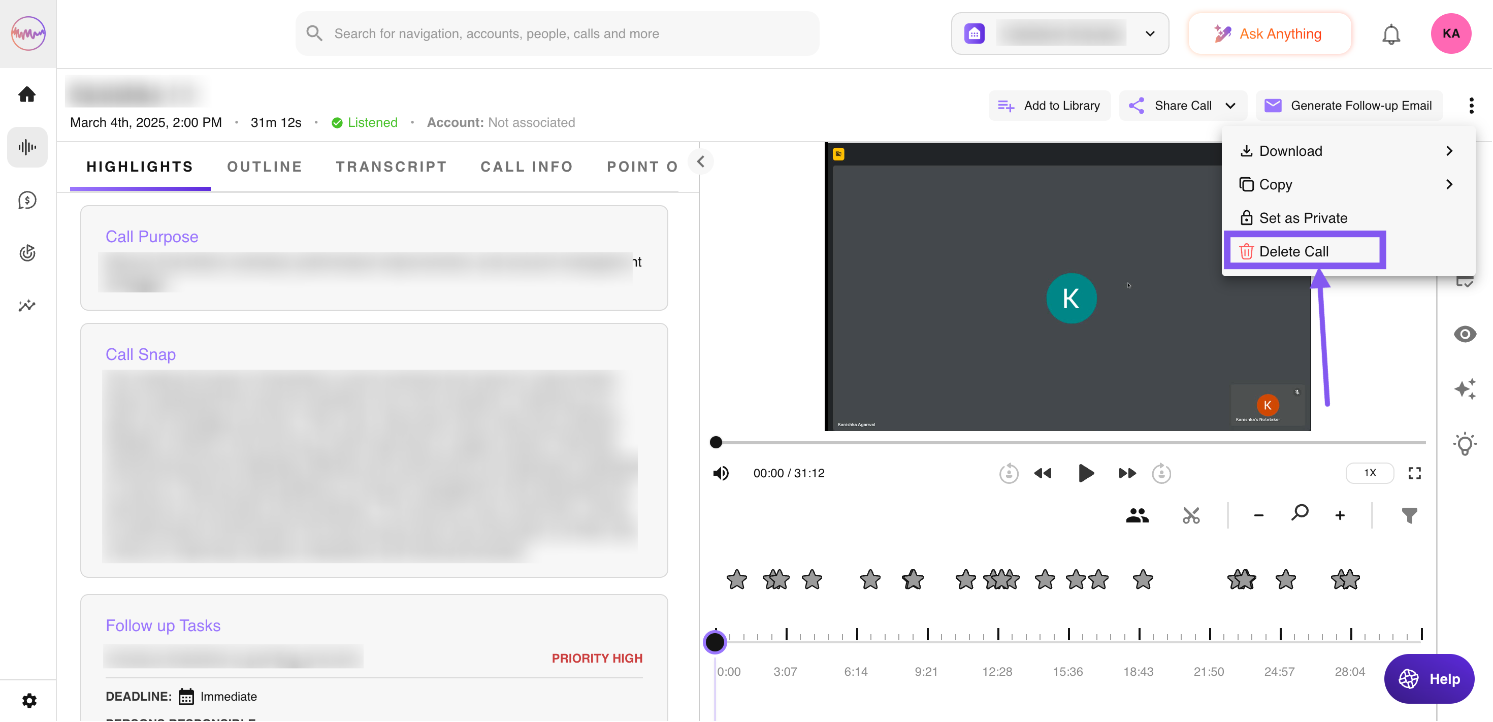 If a recording wasn’t stopped during the call, you can still delete it from Outdoo AI later.