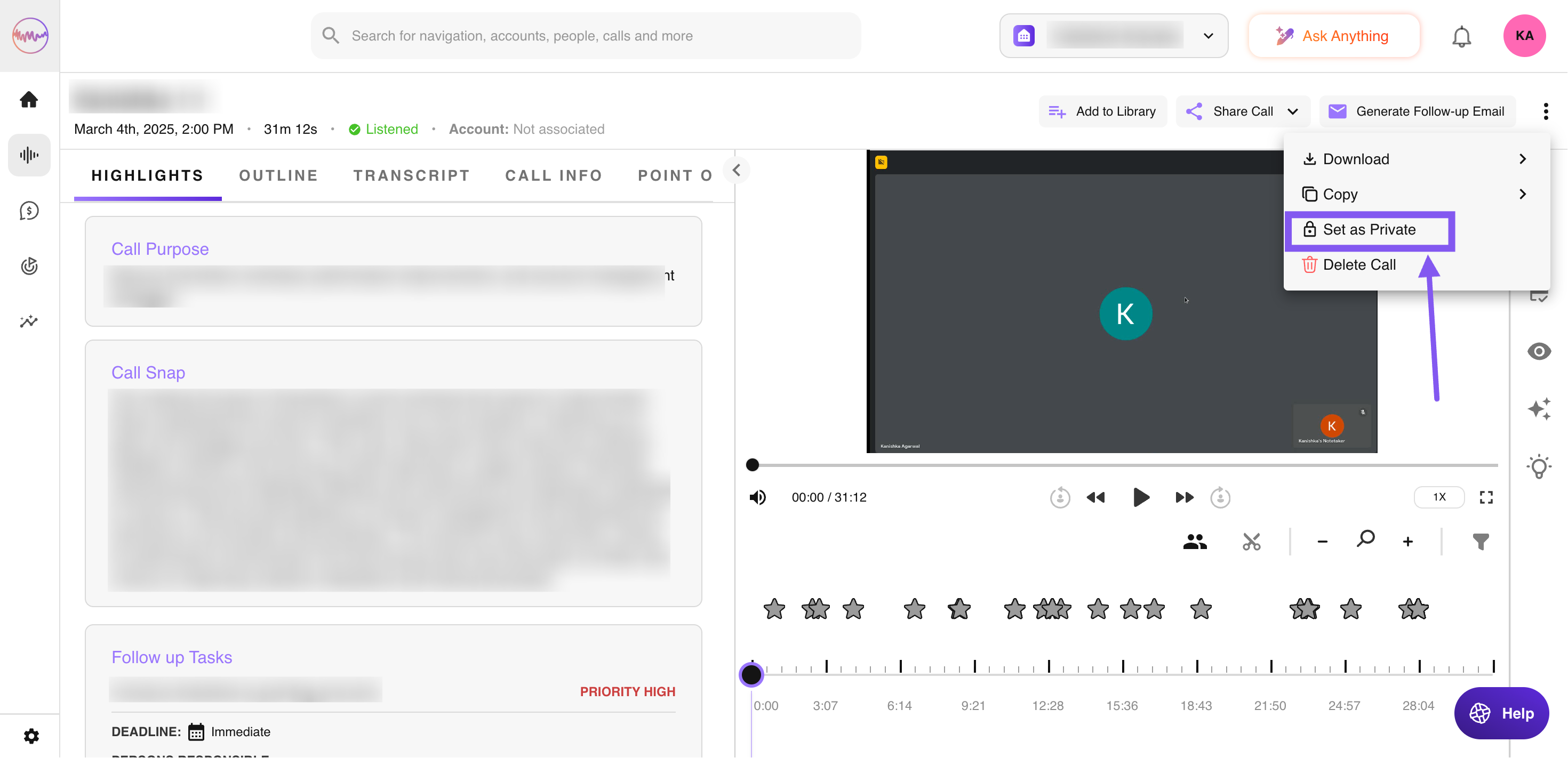 - Calls in Outdoo AI default to public. To change the visibility of a recorded call, the call owner (with proper permissions) can do so.