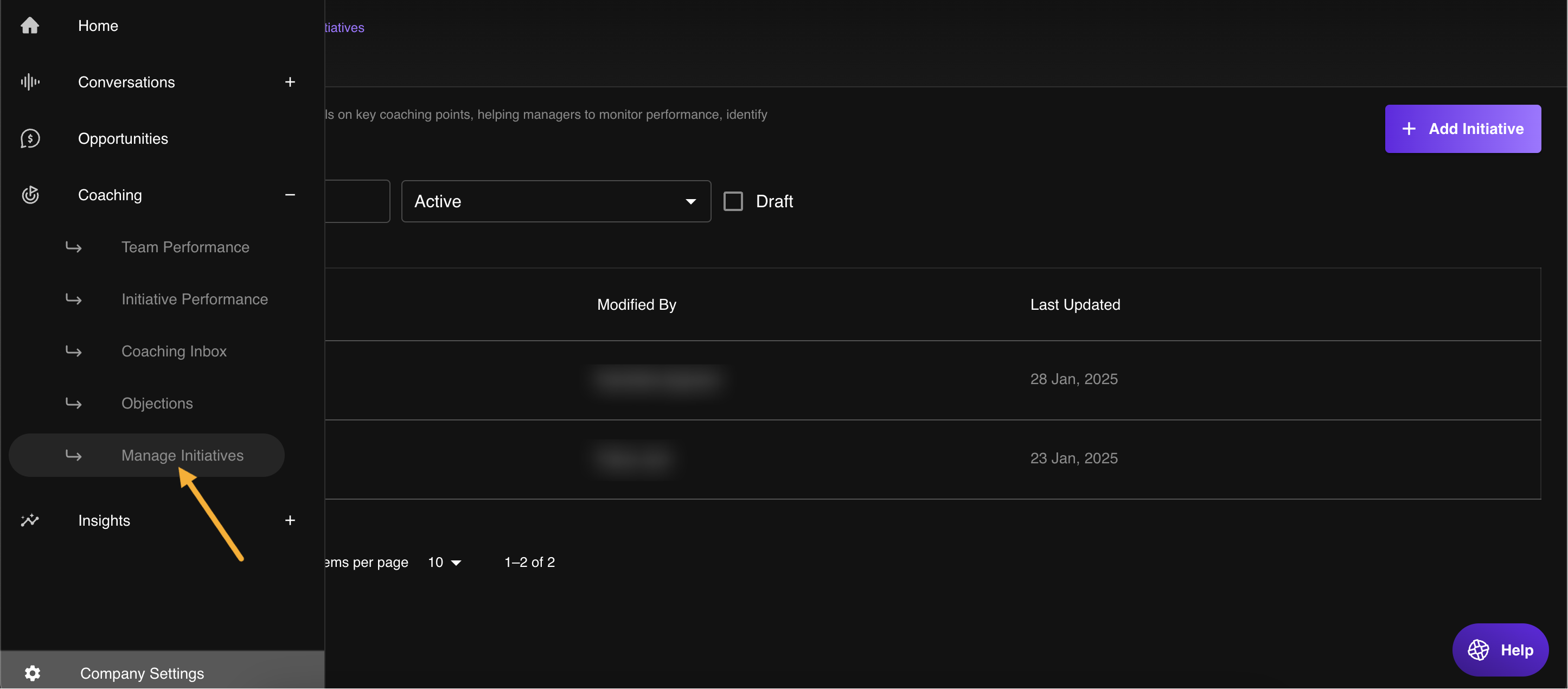 - Go to Company Settings > Coaching > Manage Initiatives, or